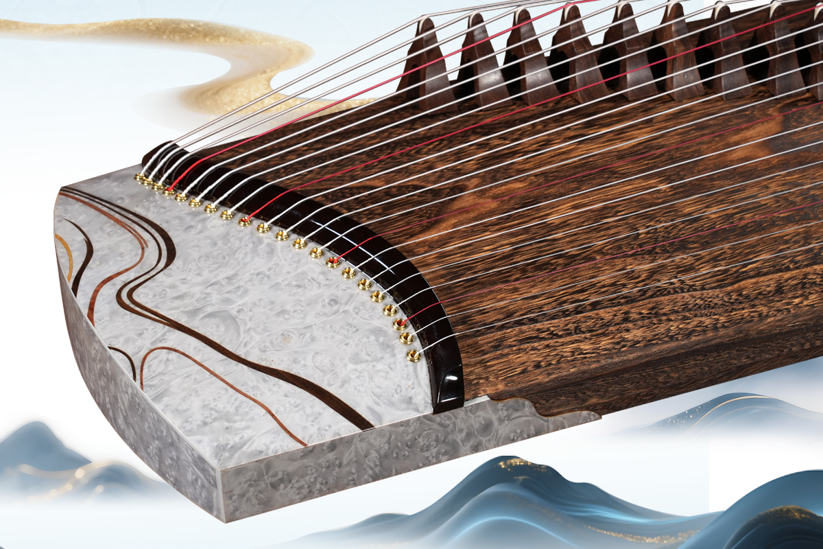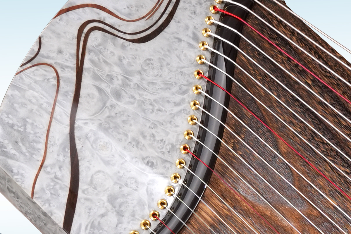 半挖筝的弧形音腔,让面板形成“中间薄、边缘厚”的科学结构——中间薄的发音区振动充分,高频清亮通透;边缘厚的镶拼区则起到稳定支撑作用,让低频沉稳浑厚,从而实现“高、中、低频均衡饱满”的声学效果。