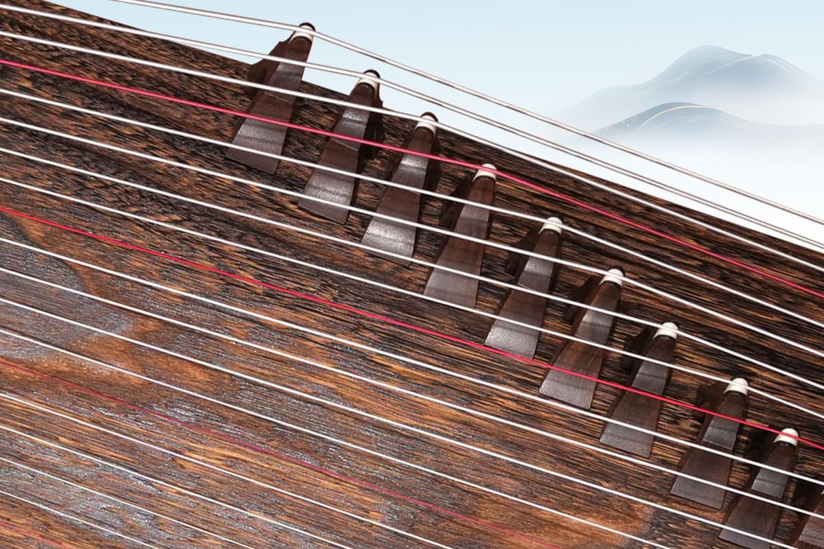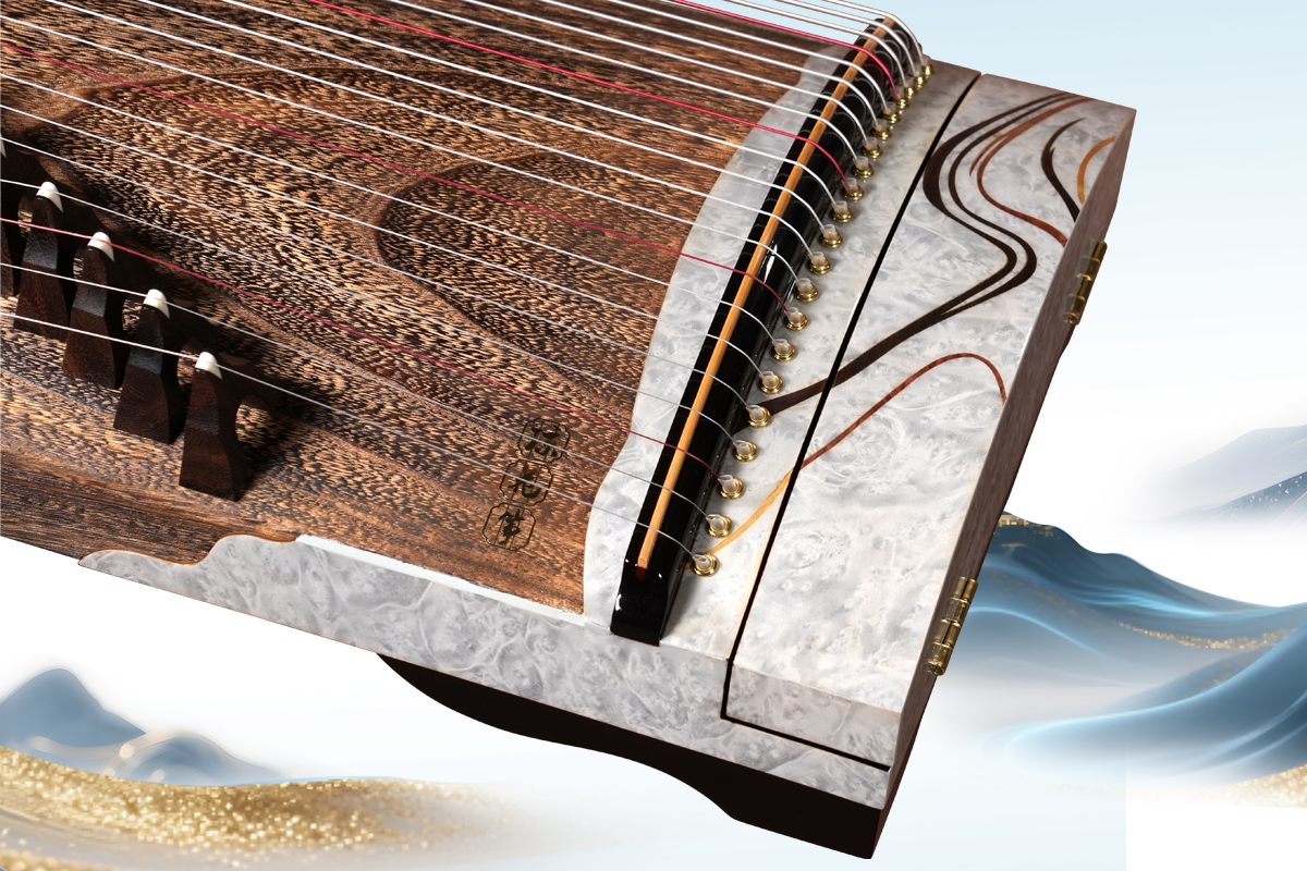 此筝设计灵感源自天地间亘古的宁静与流动的哲思,如星河轨迹,映着千年的璀璨。高级灰的基调上,以抽象的木纹线条不勾勒具体的物象,取意于风的轨迹、水的波纹、山的轮廓,绘就一幅流动的写意图,褪去了浮华,回归了本真。